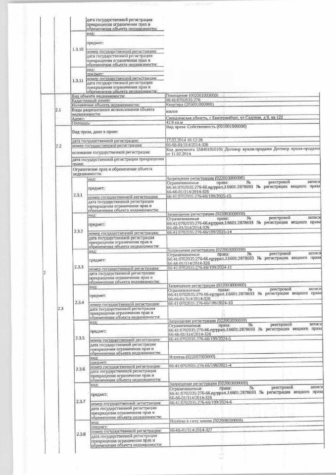 Должник: Сидоркин В.И., Собственник: Сидоркин В.И. Лот: Жилое помещение (квартира), площадь 42,8 кв.м., кадастровый номер: 66:41:0702035:276, г. Екатеринбург, ул. Садовая, д. 9, кв. 122, (зарегистрированные лица - 2 взрослых), н/ц: 3316360 р, з-к: 3316 р, код: 0014, рег. 03-2820/25