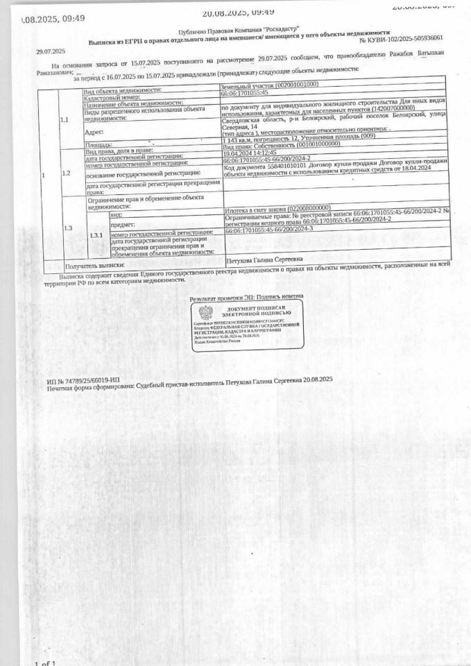 Должник: Ражабов Б.Р., Собственник: Ражабов Б.Р. Лот: Земельный участок (земли населенных пунктов, для индивидуального жилищного строительства), площадь 1143 кв.м., кадастровый номер: 66:06:1701055:45, Белоярский р-н, р.п. Белоярский, ул. Северная, 14, н/ц: 297160 р, з-к: 297 р, код: 0014, рег. 19-2224/25