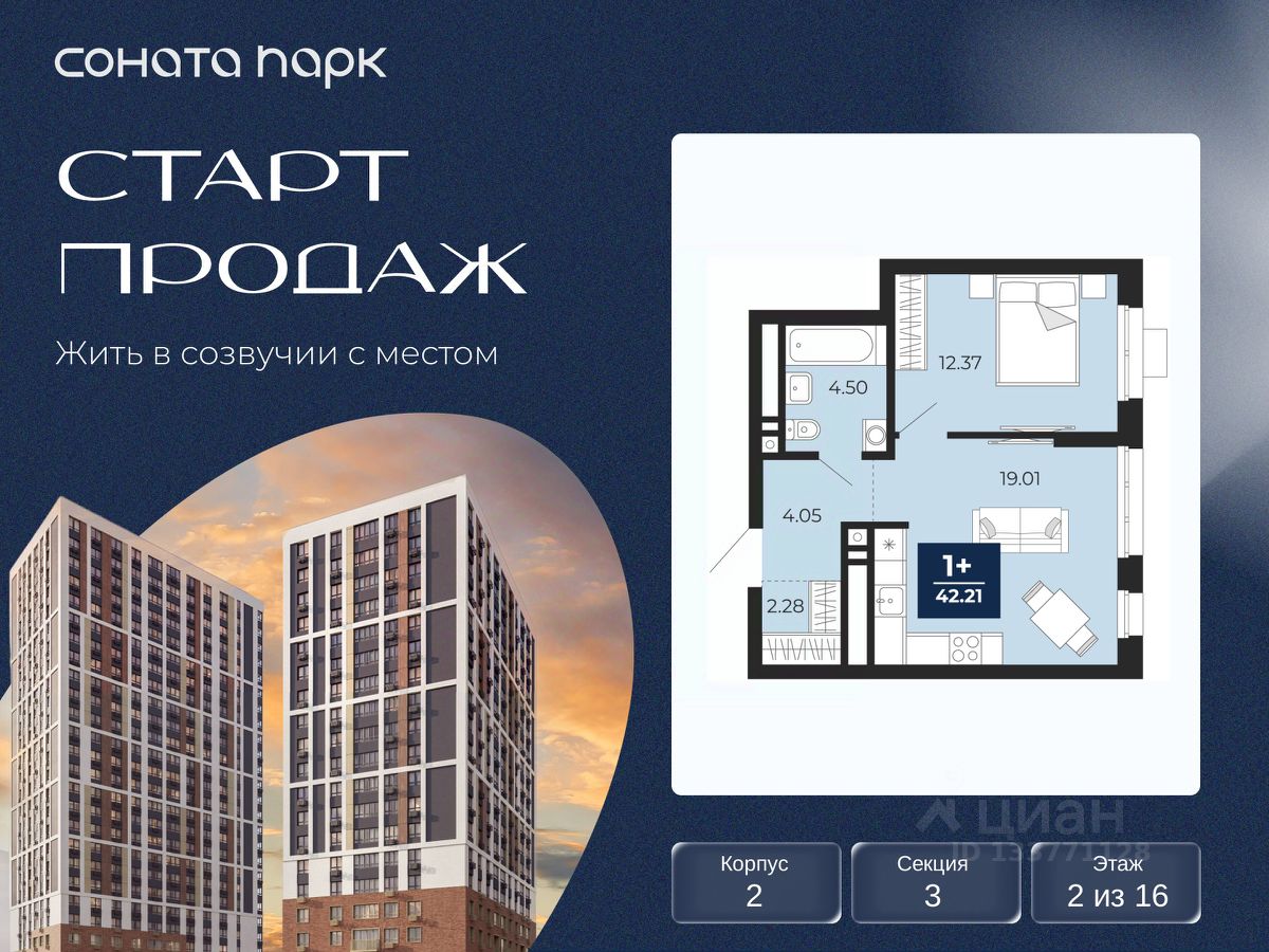 1-комн. квартира с предчистовой отделкой в ЖК ''Соната Парк'' на 2 этаже. Общая площадь: 42.21 кв.м., жилая: 12.37 кв.м., площадь просторной кухни-столовой: 19.01 кв.м. Все окна выходят на одну сторону. В квартире один совмещенный санузел. Высота потолков 2.72 м.