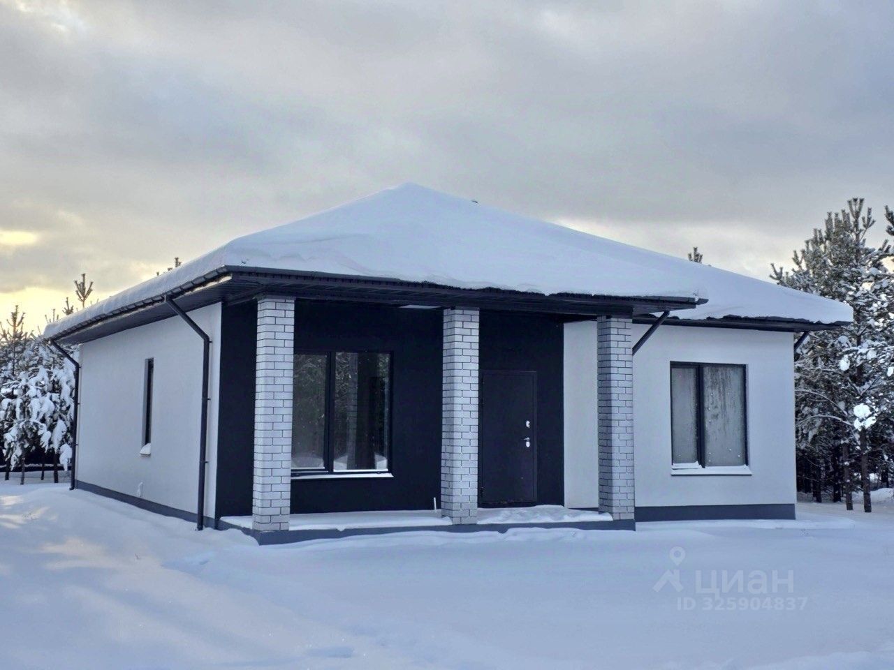 Просторная бетонная терраса у входа станет отличным пространством для отдыха на свежем воздухе, она защищена от дождя и снега. Терраса под крышей станет удобной зоной для хранения детской коляски или велосипедов. Три кирпичные колонны подчеркивают уникальность и задают ритм фасаду. Большие окна наполняют дом светом и создают ощущение простора. Окна имеют наружную темно-серую ламинацию. Объемная металлочерепица крыши в одной цветовой гамме с окнами завершают единый облик здания. Надежная водосточная система и снегозадержатели обеспечат спокойствие в любую погоду. Бетонная отмостка по периметру — это не только защита фундамента, но и отличная прогулочная зона.
