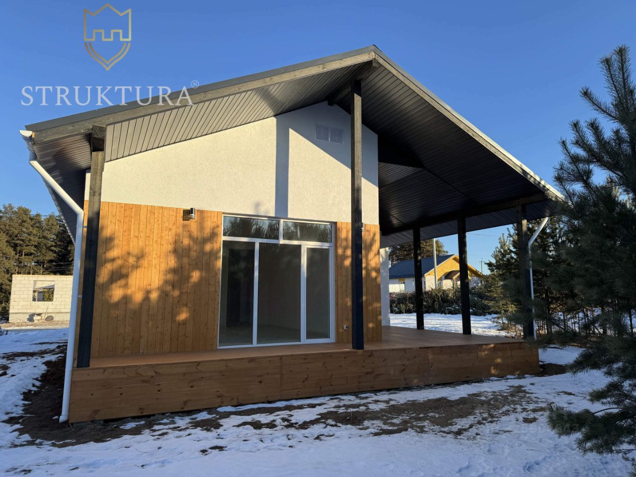 При входе вас встречает уютное крыльцо под навесом, которое обеспечит защиту от дождя и снега. Внутри расположены три полноценные спальни. Просторная кухня-гостиная станет идеальным местом для семейных ужинов и встреч с друзьями. А выход на террасу из дерева под крышей позволит вам наслаждаться свежим воздухом и живописными видами на природу, не покидая домашнего уюта.