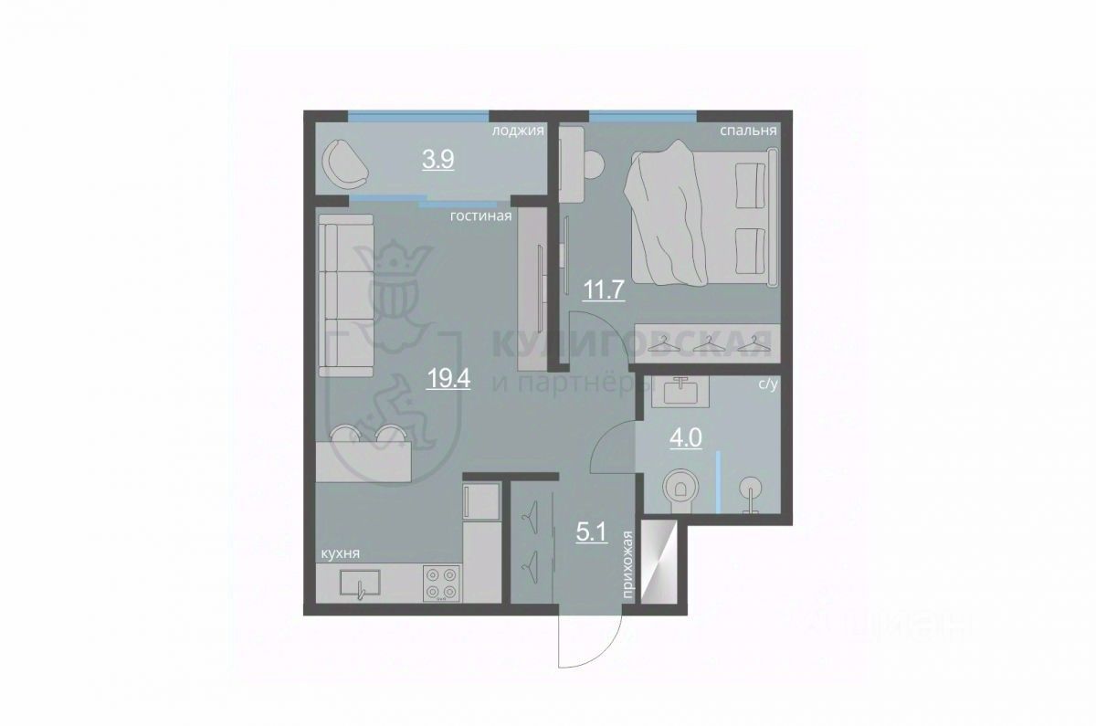 - Кухня-гостиная 19.4 м² — светлое и просторное пространство для кулинарных шедевров и приятных встреч с друзьями.