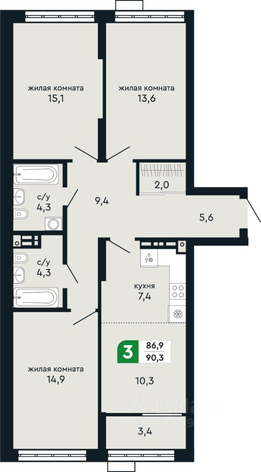 Общая площадь90,3 м2