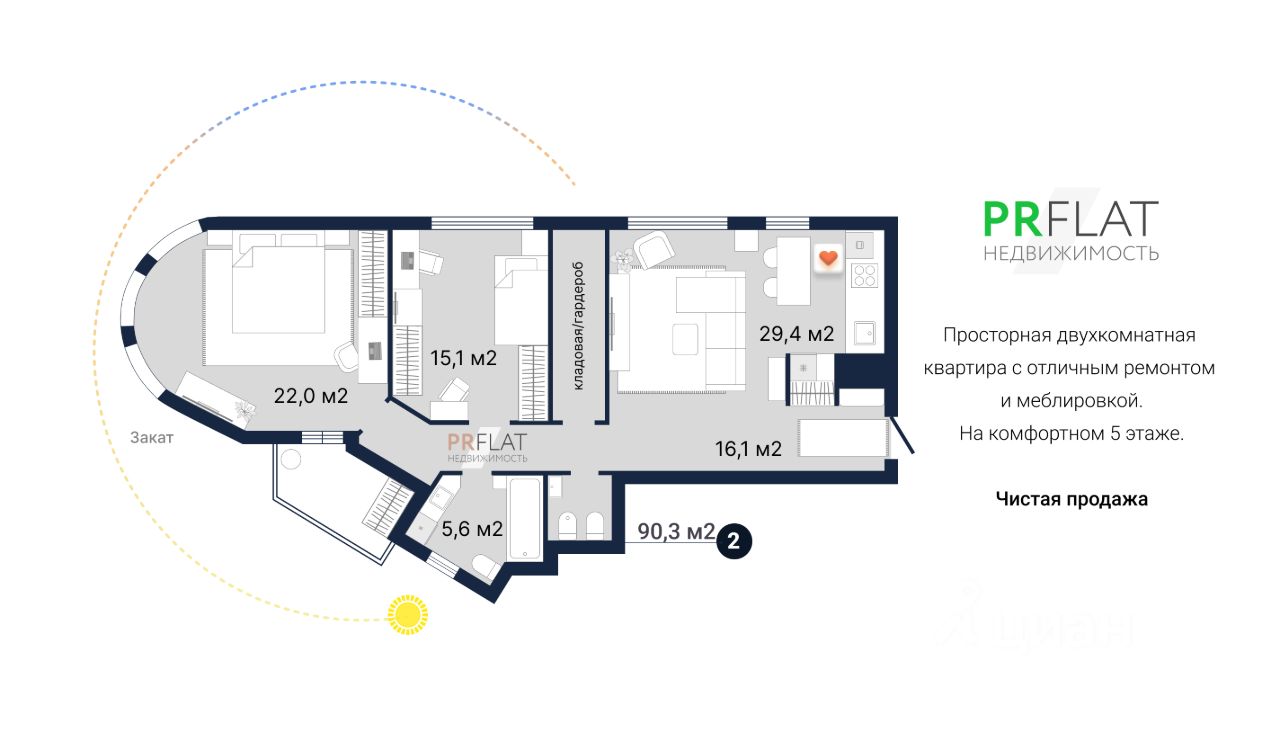 Окна на три стороны - юг, запад и север. Расположена квартира на комфортном 5 этаже из 22.