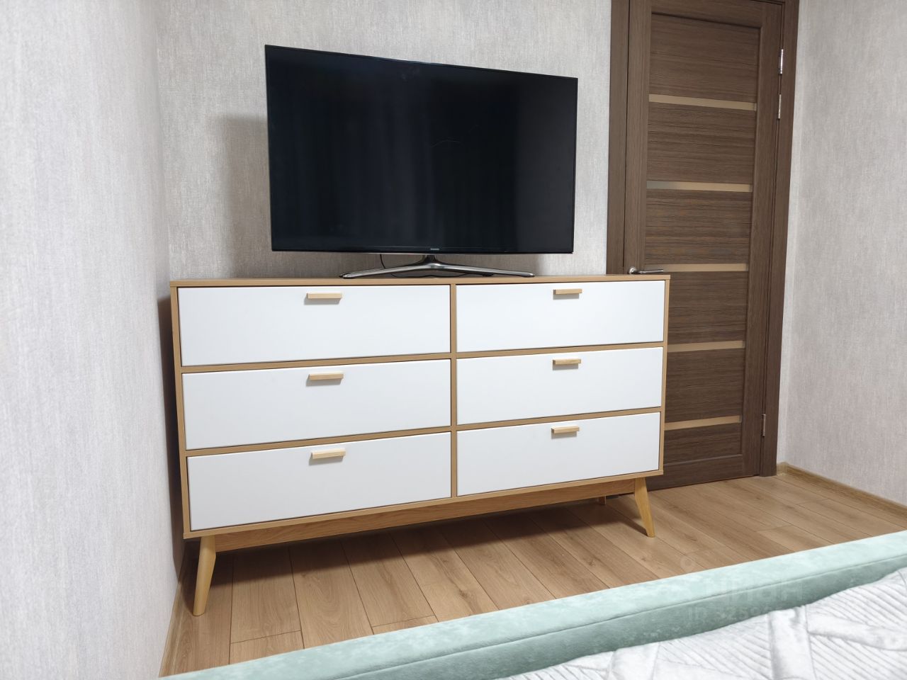 В спальне большая кровать на 160см. Пуф, на котором стоит ночник. Напротив кровати во всю стену стоит вместительный комод на шесть ящиков. Люстра также с пультом и несколькими режимами освещения. Подушки,одеяла.