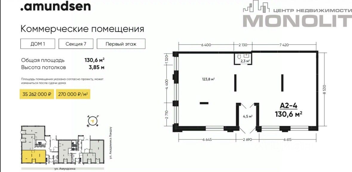 Характеристики : Общая площадь - 130,6 кв.м. Первый этаж. Отдельный вход. Угловое помещение. Первая линия. Выходит на улицу Амундсена. Высота потолка - 3,85 м. Панорамное остекление. Правильная планировка. Помещение без отделки. Срок сдачи - конец 26-го - начало 27-го года.