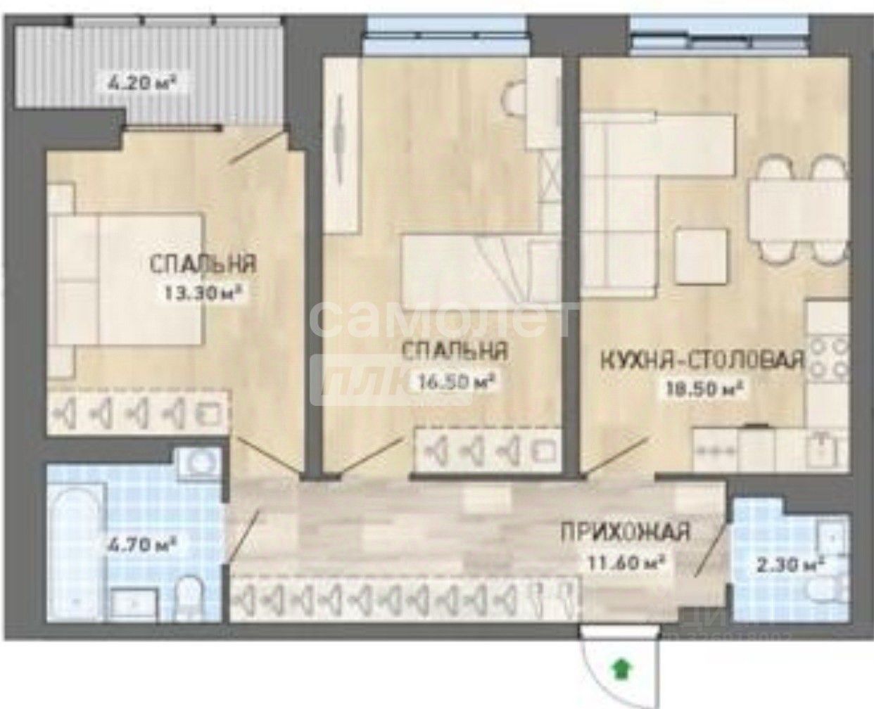 Планировка, в которую влюбляются с первого взгляда: • Общая площадь — 66,9 кв.м • Две изолированные спальни • Кухня-гостиная 18,5 кв.м — идеальное пространство для семейных ужинов и встреч с друзьями • Жилая площадь — 29,8 кв.м • Два санузла — комфорт для всей семьи • Большой застеклённый балкон 4.2 кв.м
