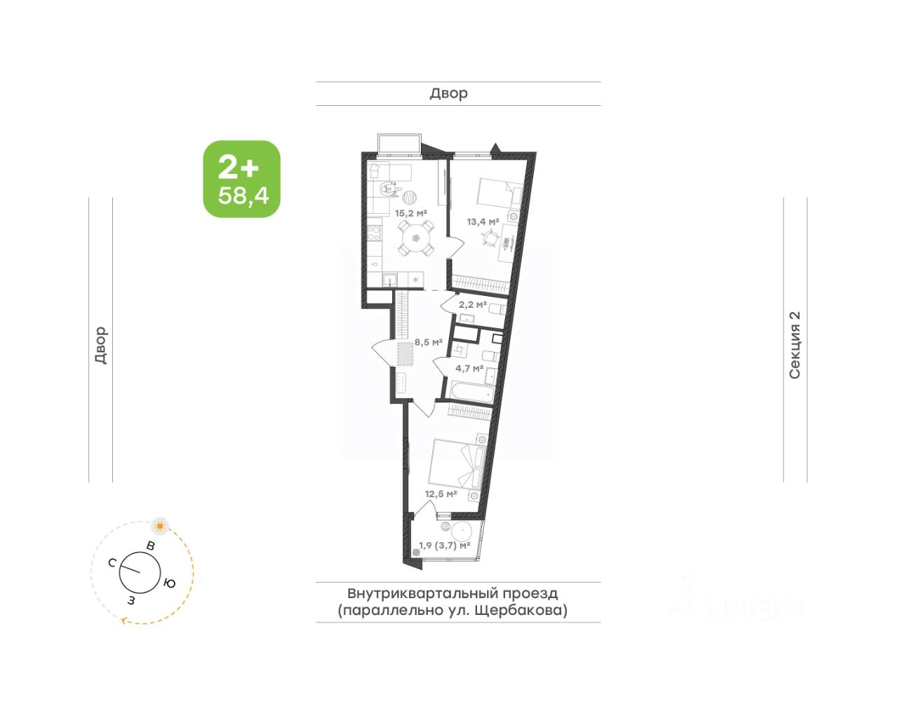 Классика в современной интерпретации Кухня-гостиная — место для общения, отдыха и вечеров в кругу семьи Родительская спальня с выходом на лоджию дарит ощущение уединения и комфорта. Место под шкаф оптимально решает вопросы хранения, а само пространство остаётся свободным и просторным, идеально подходящим для отдыха Детская с продуманной системой хранения позволит организовать функциональное пространство для игр, учёбы и сна. Здесь не будет лишних вещей, а каждый предмет найдёт своё место Два санузла позволяют легко справляться с утренними и вечерними заботами. Первый с ванной и местом под стиральную машину — это удобно и практично. Второй— ещё один важный элемент для вашего комфорта Просторная прихожая дарит ощущение лёгкости и организованности.