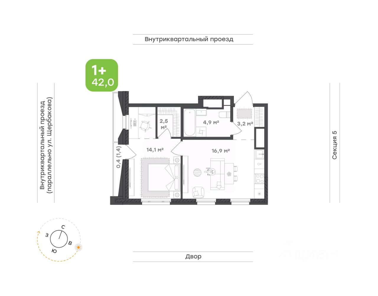 Мастер-спальня с собственной гардеробной и уютным рабочим местом— уголок комфорта и уединения. Окна на две стороны и французский балкон делают комнату светлее и просторнее