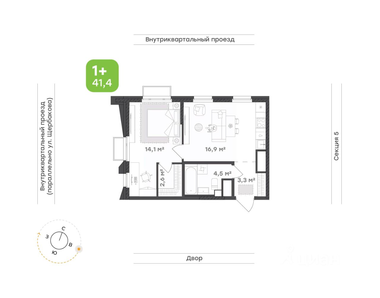 Идеальный вариант для самостоятельной жизни Кухня-гостиная с двумя окнами — сердце квартиры, наполненное светом и уютом. Здесь удобно готовить, принимать гостей или отдыхать после долгого дня Спальня с окнами на две стороны— место для отдыха и восстановления. Пространство продумано так, чтобы здесь было комфортно и уютно. Собственная гардеробная поможет организовать хранение без перегруженности интерьера. Грамотное зонирование места для отдыха и рабочего пространства позволит отдыхать и работать одновременно, не мешая друг другу. Санузел — стильный и функциональный. Достаточно места для всей необходимой сантехники, а грамотная планировка делает пространство удобным Прихожая встречает продуманным местом для хранения.