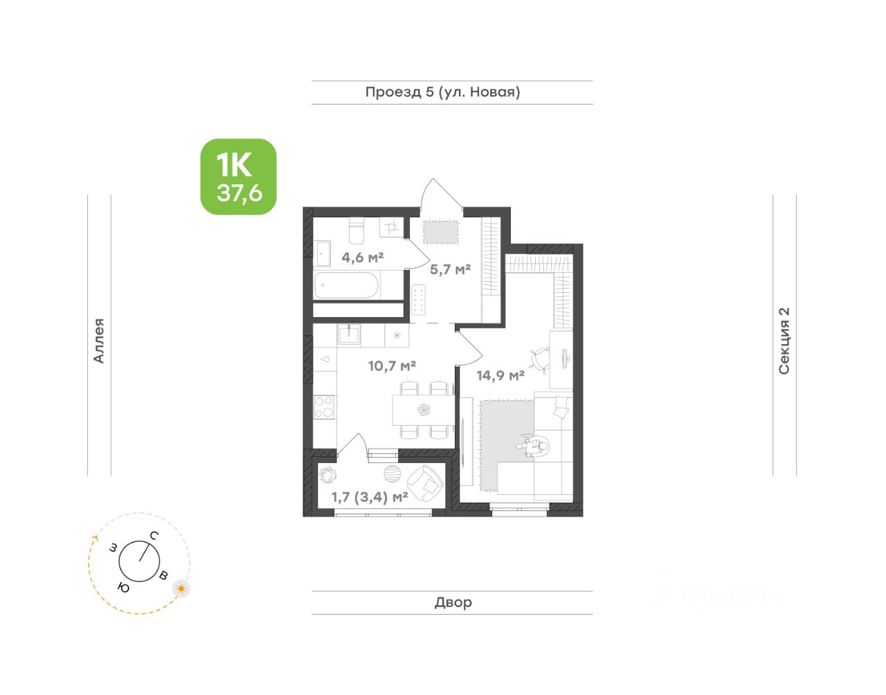 Современный санузел 4,6 м² отличается удобством планировки, а просторная прихожая 5,7 м² позволяет организовать функциональную зону хранения