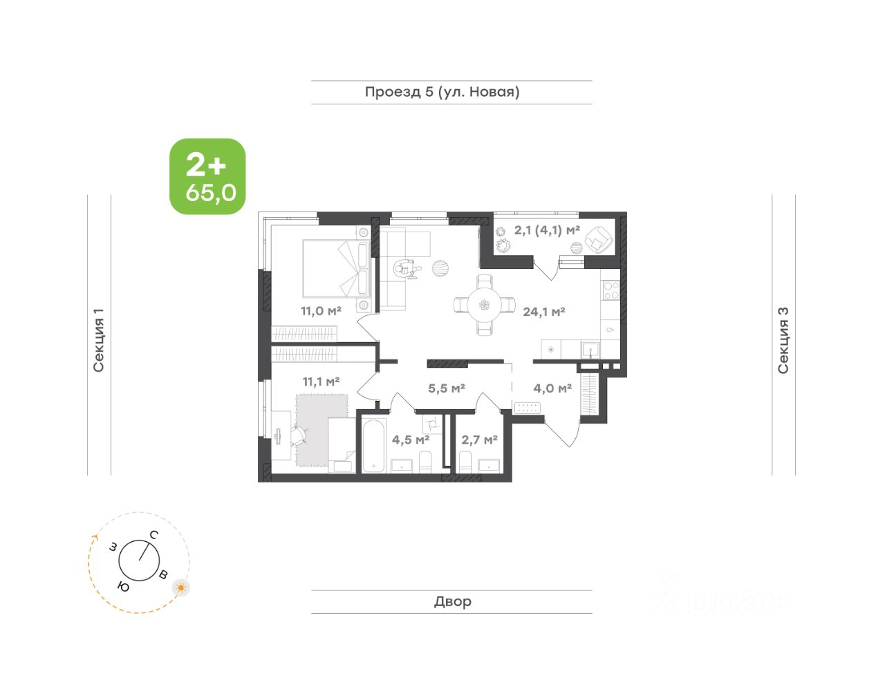 Квартира для тех, кто любит свет и простор Кухня-гостиная 24,1 м² — просторная и наполненная светом. Здесь легко зонировать пространство: выделить комфортную кухню, обеденную зону и место для отдыха. А выход на лоджию 4,1 м² открывает живописный вид на город, позволяя наслаждаться им в любое время дня Родительская спальня 11,0 м² — уединённое пространство с большим угловым окном. Светлая, просторная и продуманная до мелочей. Предусмотрено место под шкаф, чтобы хранение вещей было удобным, а интерьер оставался лёгким и гармоничным Детская 11,1 м² — уютная и функциональная. В ней комфортно и играть, и заниматься, а благодаря правильной форме комнаты можно легко организовать удобное пространство Два санузла делают жизнь в квартире ещё комфортнее. Основной 4,5 м² с ванной — место для расслабления, а дополнительный 2,7 м² позволяет избежать утренних очередей Прихожая 4,0 м² и коридор 5,5 м² создают удобную навигацию по квартире. Достаточно места для систем хранения, чтобы вещи всегда были под рукой