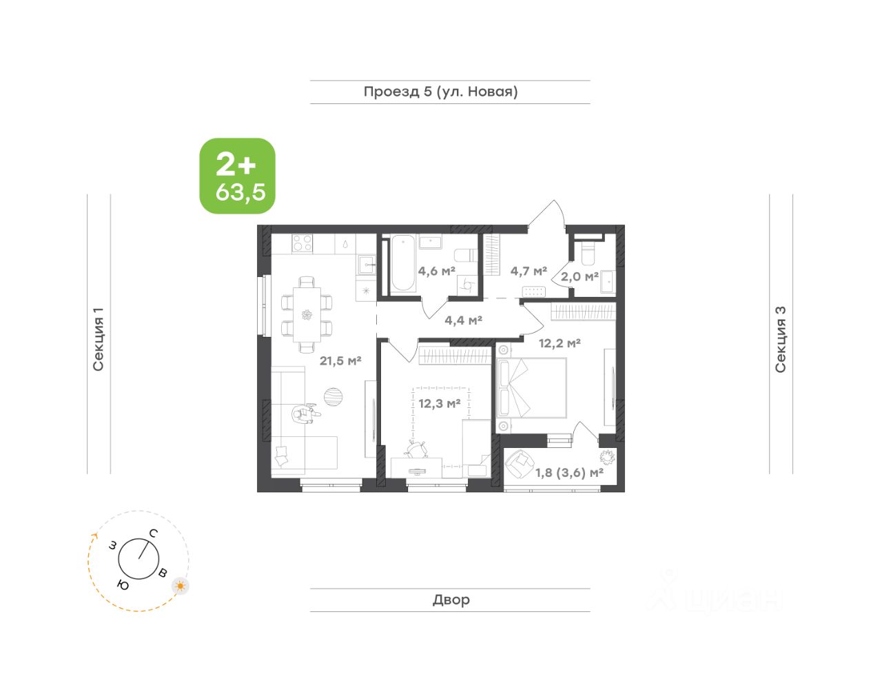 Квартира для небольшой и счастливой семьи Кухня-гостиная 21,5 м² объединяет в себе удобство и эстетику. Здесь легко готовить, собираться за общим столом и проводить вечера в тёплой обстановке. Большая площадь даёт возможность зонировать пространство и создать уютный уголок для отдыха Два санузла избавят от утренней спешки. Ванная комната 4,6 м² станет личной зоной релакса, а дополнительный санузел 2,0 м² добавит удобства в повседневной жизни Прихожая 4,7 м² продумана до мелочей. Место для хранения организовано так, чтобы вещи не загромождали пространство, а порядок поддерживался легко и естественно Спальня 12,2 м² наполнена естественным светом и уединённостью. Выход на лоджию 3,6 м² создаёт дополнительное пространство для отдыха и позволяет наслаждаться тишиной двора Детская 12,3 м² — уютная и многофункциональная. Достаточно места и для игр, и для спокойного обучения, а окно во двор делает комнату светлой и комфортной в любое время дня