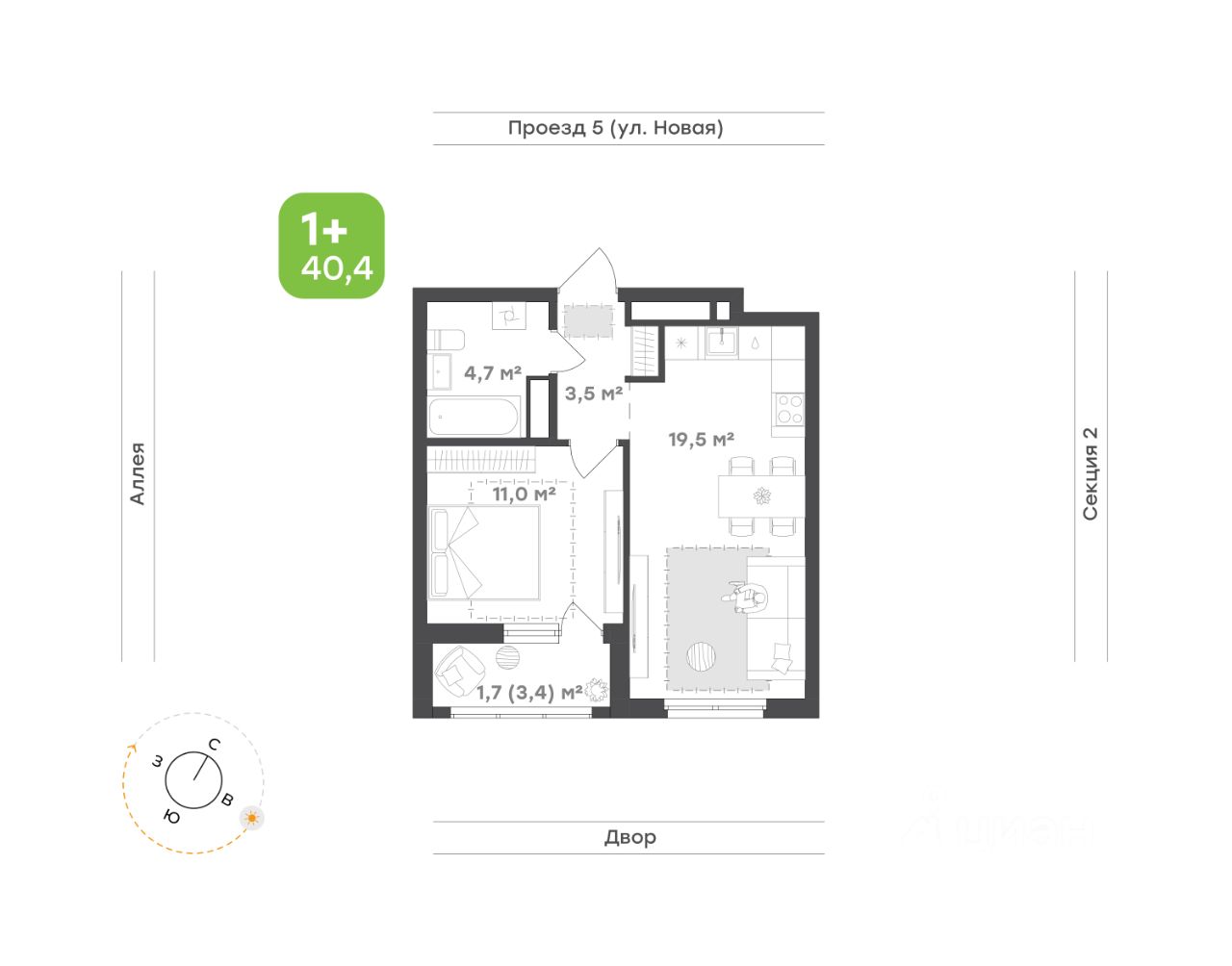 Кухня-гостиная 19,5 м² — сердце квартиры, наполненное светом и воздухом. Здесь удобно готовить, встречать гостей и проводить уютные вечера за настольными играми или просмотром фильмов
