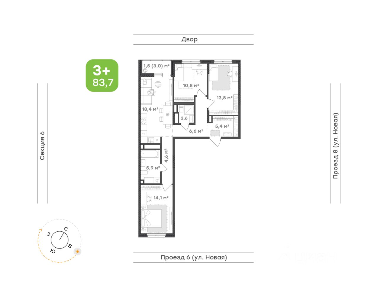 Просторная кухня-гостиная 18,4 м² с выходом на лоджию 3,0 м² открывает вид на тихий двор, даря ощущение уюта и покоя в суматохе города