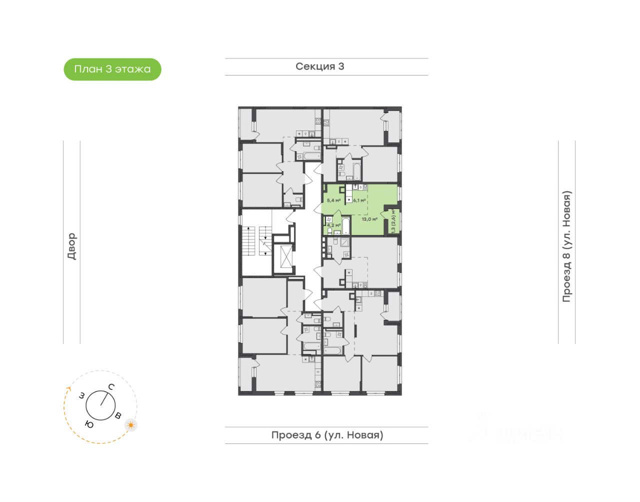 Зона кухни 6,1 м² объединена с гостиной, формируя открытое пространство, в котором легко готовить любимые блюда и наслаждаться общением с друзьями