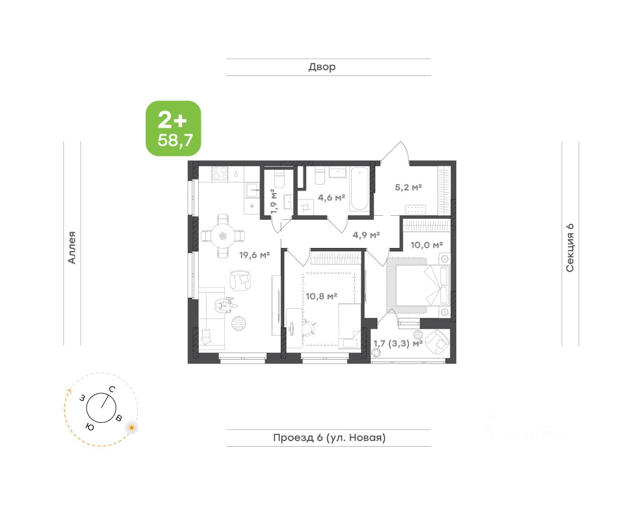 Квартира для счастливой семьи Концепция ''тихий дом'': все квартиры в доме с чистовой отделкой, никаких шумных ремонтных работ с утра до вечера Кухня-гостиная 19,6 м² объединяет в себе удобство и эстетику. Здесь легко готовить, собираться за общим столом и проводить вечера в тёплой обстановке. Большая площадь даёт возможность зонировать пространство и создать уютный уголок для отдыха Два санузла избавят от утренней спешки. Ванная комната 4,6 м² станет личной зоной релакса, а дополнительный санузел 1,9 м² добавит удобства в повседневной жизни Прихожая 5,2 м² продумана до мелочей. Место для хранения организовано так, чтобы вещи не загромождали пространство, а порядок поддерживался легко и естественно Спальня 10,0 м² наполнена естественным светом и уединённостью. Выход на лоджию 3,3 м² создаёт дополнительное пространство для отдыха и позволяет наслаждаться тишиной двора Детская 10,8 м² — уютная и многофункциональная. Достаточно места и для игр, и для спокойного обучения, а окно делает комнату светлой и комфортной