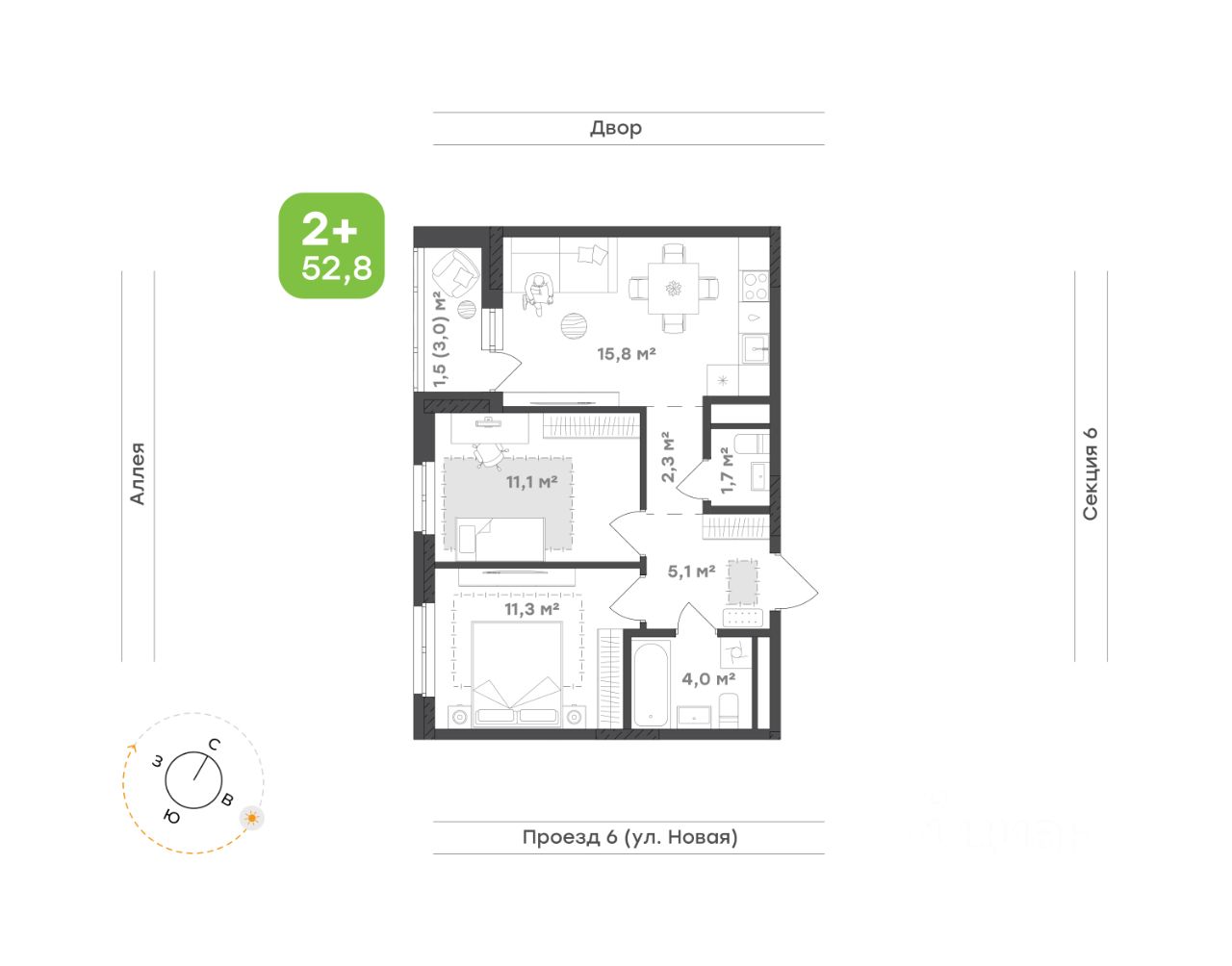 Квартира для тех, кто хочет окунуться в мир современного уюта и функциональности Концепция ''тихий дом'': все квартиры в доме с чистовой отделкой, никаких шумных ремонтных работ с утра до вечера Кухня-гостиная 15,8 м² объединяет в себе стиль и практичность, а выход на лоджию 3,0 м² с видом на аллею дарит ощущение спокойствия и свежести Родительская спальня 11,3 м² становится личным уютным уголком, где предусмотрено место под шкаф для идеальной организации пространства Детская 11,1 м² — светлая и радостная, с продуманным местом под шкаф, где каждая деталь способствует комфортному росту и развитию Просторная прихожая 5,1 м² со шкафом-купе позволяет хранить вещи аккуратно и организованно Коридор 2,3 м² создаёт плавное и логичное соед