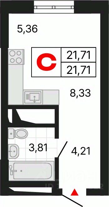 1-комн. квартира-студия с предчистовой отделкой в ЖК ''Алиса'' на 19 этаже. Общая площадь: 21.71 кв.м., площадь гостиной 13.69 кв.м., из которых 5.36 кв.м. выделено под кухонную зону. Все окна выходят на одну сторону. В квартире один совмещенный и один раздельный санузел. Высота потолков 2.72 м.