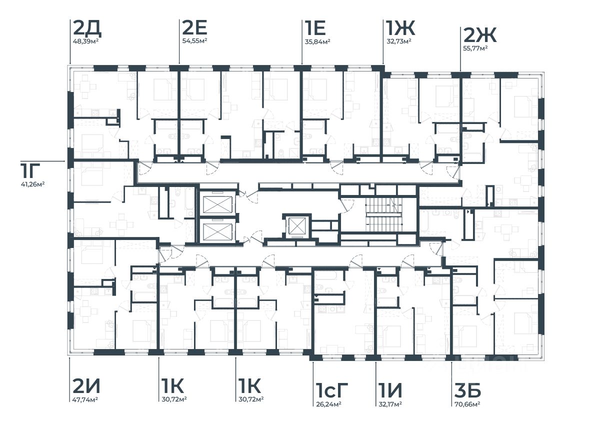 - Кладовые помещения на каждом этаже и на -1 этаже. В проекте 25 планировочных решений: от уютных студий от 21,51 м² до квартир с тремя спальнями и кухней-гостиной до 66,58 м² с функциональным разделением на гостевую и приватные зоны.
