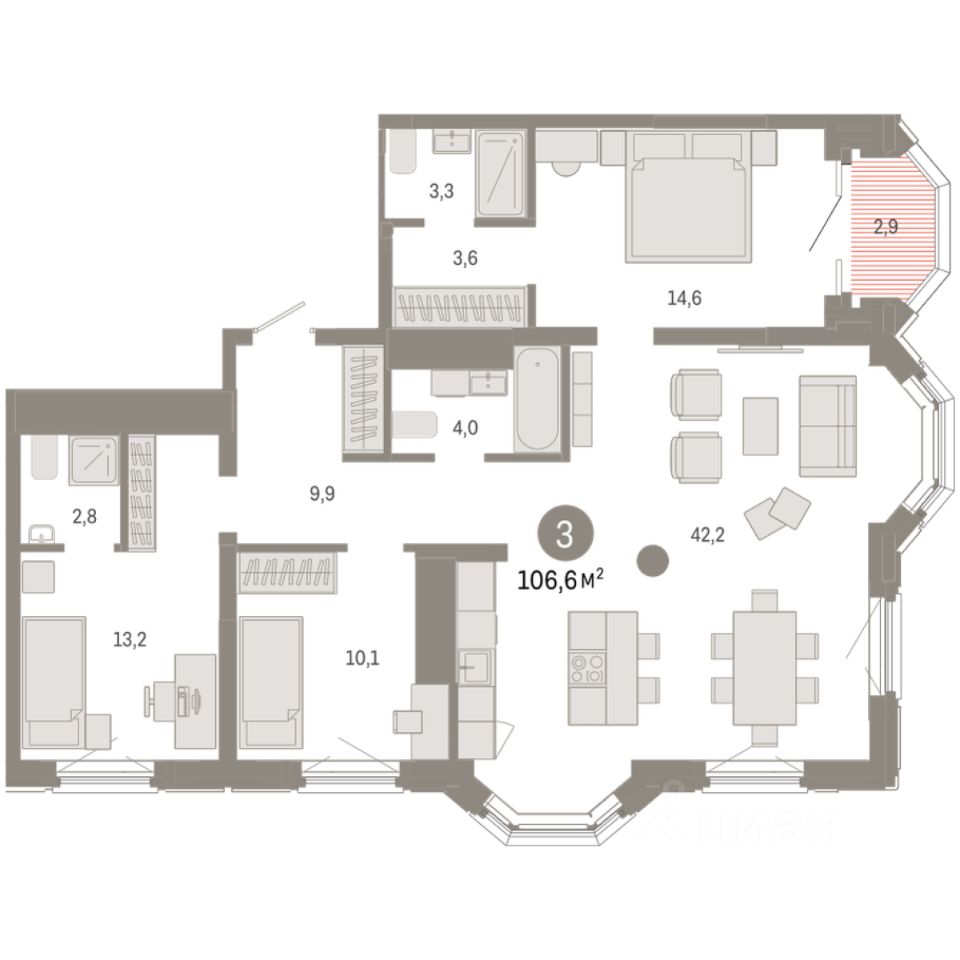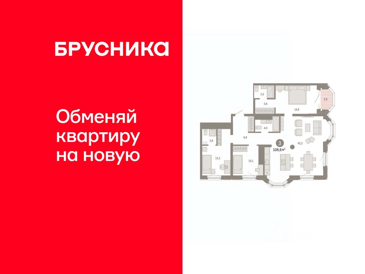 Квартира с кухней-гостиной и тремя спальнями в квартале ''На Некрасова''. Особенности планировки: вид во двор, второй санузел, лоджия, мастер-спальня, предчистовая отделка, разнесённые спальни. квартиры в нашей базе: НКР02-Ж1.17.7.