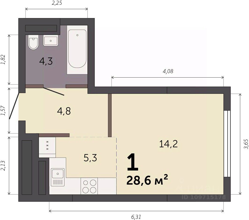 продам 1-к, Базовый переулок, 47х5 309 304 ₽