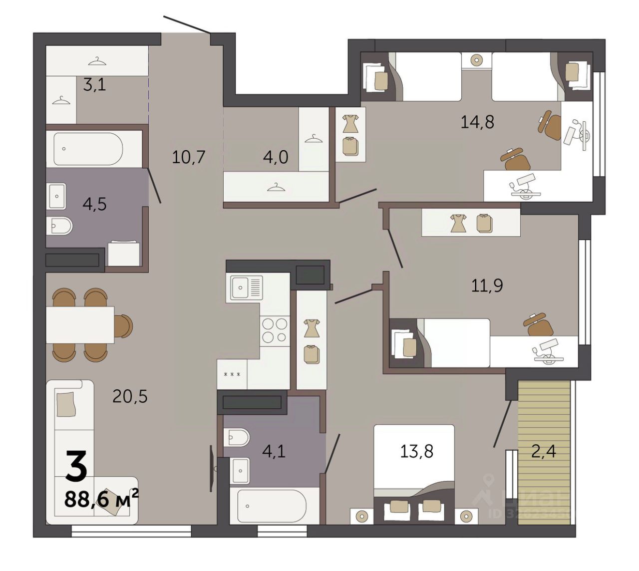 Продаётся 3-комнатная квартира в строящемся доме (Секция 1.1), срок сдачи: I-кв. 2028, общей площадью 88.6 кв.м., на 4 этаже. Новый жилой комплекс ''Парк Культуры'' от застройщика ''СЗ Новый Дом'' расположен по адресу: г. Екатеринбург, Базовый переулок.