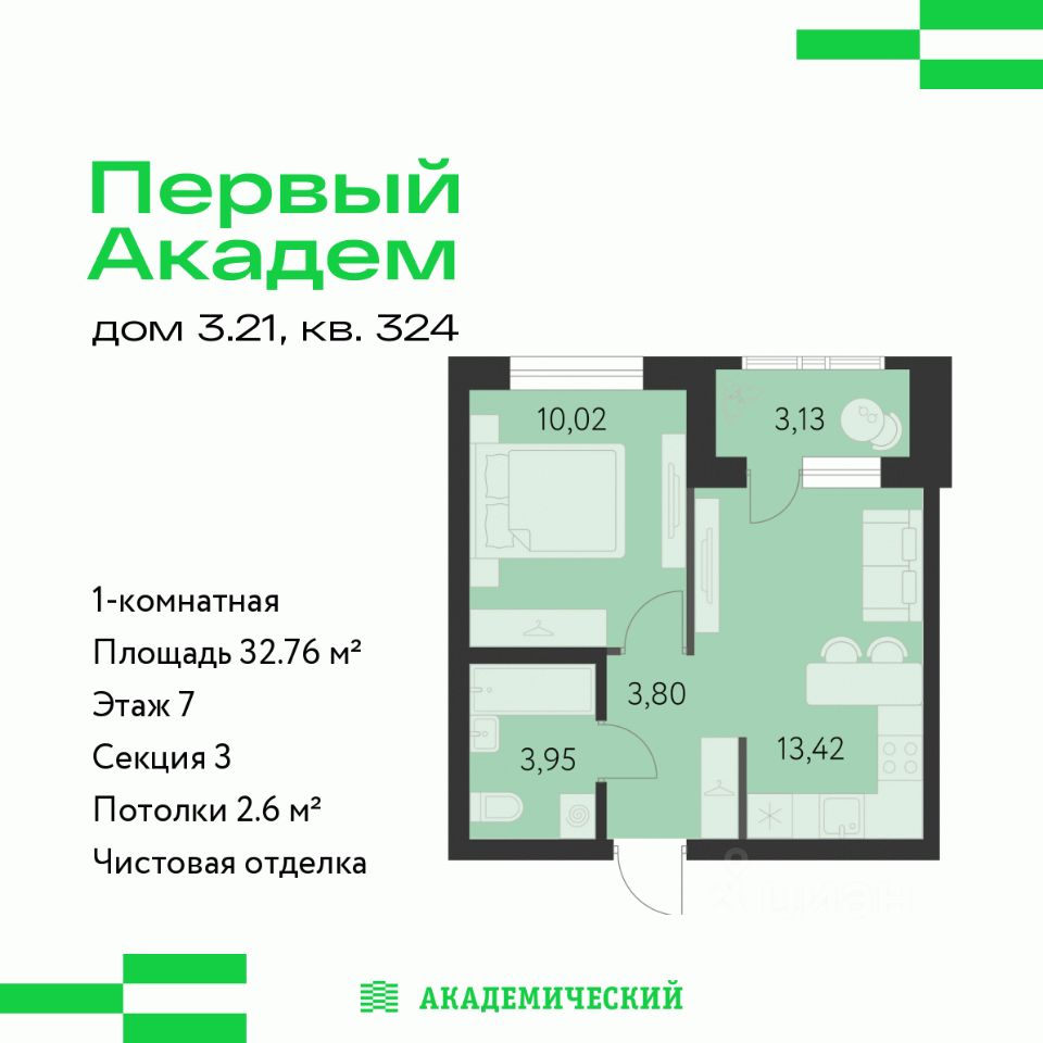 Продается 1-комнатная квартира площадью 32.76 кв.м. от девелопера ''Академический'' в жилом квартале ''Первый Академ''. Срок сдачи дома в 2028 году. Выгоды и скидка напрямую от застройщика.