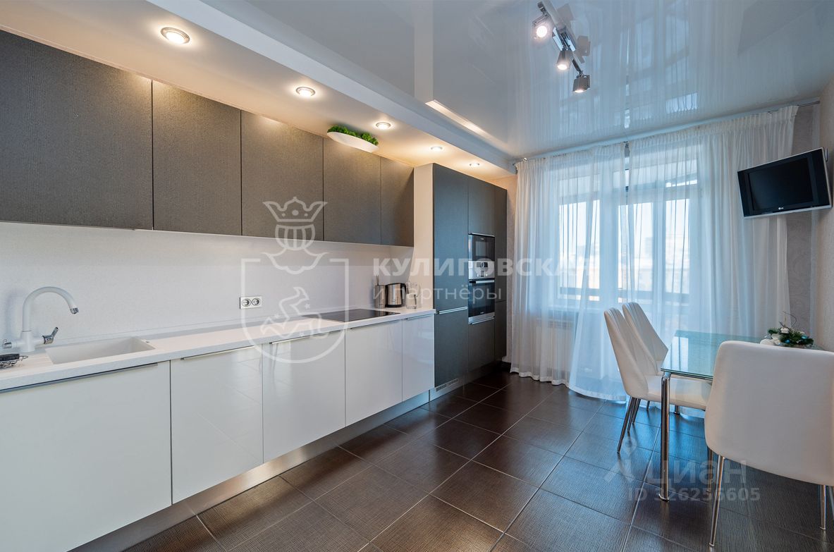 Кухня-гостиная — сердце квартиры: лаконичные фасады, встроенная техника, выверенный свет, глянцевые поверхности и мягкие текстуры.