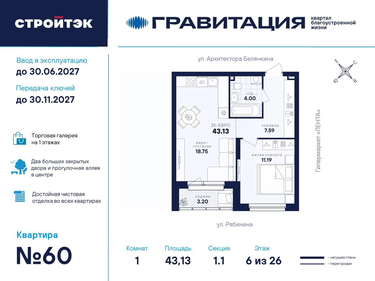 Удачные решения Новый квартал благоустроенной жизни ''Гравитация'' мы разместили в периметре улиц Рябинина и Академика Ландау. У квартала 5 этапов строительства, а всю работу мы завершим к 2030 году. Авторы проекта гармонично совместили в оформлении природные элементы и современный дизайн. Волнообразные очертания на стенах вдохновлены силой ветра и движением воды. Скруглённые углы подчеркивают элегантный силуэт, а контрастная палитра акцентов и контурная подсветка верхних этажей создают выразительный архитектурный образ. Первый этап строительства: — Секция 1.1 — 1 подъезд 26 этажей — Секция 1.2 — 2 подъезда 16 этажей — Секция 1.3 — 1 подъезд 12 этажей Здесь всё и сразу Гравитация — уютный и обособленный, и в то же время открытый и просторный квартал. Всё рядом: супермаркеты и парки, кино и рестораны, школы и сады. В нескольких шагах набережная реки Патрушихи. В квартале построят муниципальный детский сад на 200 мест, а на 5 этапе строительства мы возведём 6-уровневый надземный паркинг на 250 машин. На первых этажах домов для вас будет работать торговая галерея с магазинами, кафе и привычными бытовыми сервисами. В 1 этапе строительства 631 квартира. Своя вселенная Развитый Академический район удобен и молодым семьям, и школьникам, и состоявшимся профессионалам. Рядом большой Преображенский парк с озером и Юго-Западный лесопарк с Тропой здоровья. — 3 минуты до Гипер Ленты — 10 минут на машине до ТРЦ ''Академический'', 15 минут до ЕКАД, 25 до центра — 6 школ и 6 детских садов — Спортивные комплексы и клубы Wake up, Bright Fit и Юность Богатые возможности В квартале два просторных закрытых двора общей площадью 1,4 гектара. Один двор объединяет 1 и 2 этапы строительства, другой — 3, 4 и 5 этапы. Между дворами — камерная прогулочная аллея для неспешных вечеров или полуденного отдыха. Во дворе первого этапа — зелёные участки из хвойных деревьев, акцентных кустарников и травянистых многолетников, а также сеть дорожек, детская площадка с песочницей, аттракционами и геопластикой, настольный теннис и зона для зарядки. А для комфорта и безопасности — вечернее освещение, охрана и постоянное видеонаблюдение. Пространство с заботой В просторных светлых лобби Гравитации — интеллигентный дизайн, помещения для колясок, высокие витражи и комфортная мебель. Выходы сквозные, на улицу и во двор. Лифты грузоподъёмностью 1000 и 450 кг. Мы подготовили для вас 44 уникальных варианта продуманных планировок, в том числе с кухнями-гостиными, гардеробными и мастер-спальнями. Здесь нет бесполезных зон, зато есть где посидеть в семейном кругу и разместить всё для удобства и комфорта. Современные технологии Мы позаботились о достойной чистовой отделке, чтобы вы могли уделить время главному. — Виниловые обои на флизелиновой основе, окрашенные стены в санузлах и на лоджиях — Натяжные потолки везде, кроме лоджий, там — окрашенные — Прочный влагостойкий ламинат и керамическая плитка — Межкомнатные двери светлых тонов и сейф-дверь на входе — Эргономичное размещение розеток и выключателей