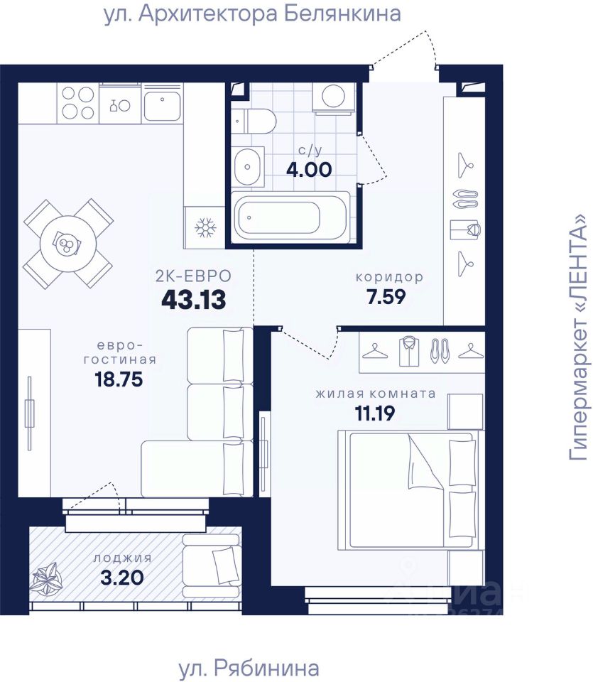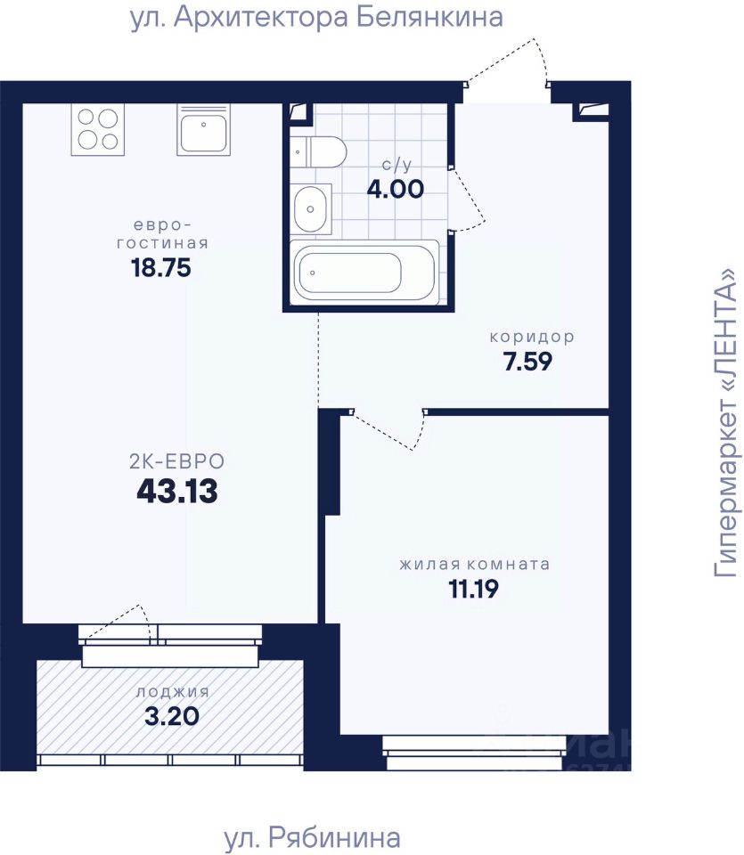 Общая площадь43,13 м2