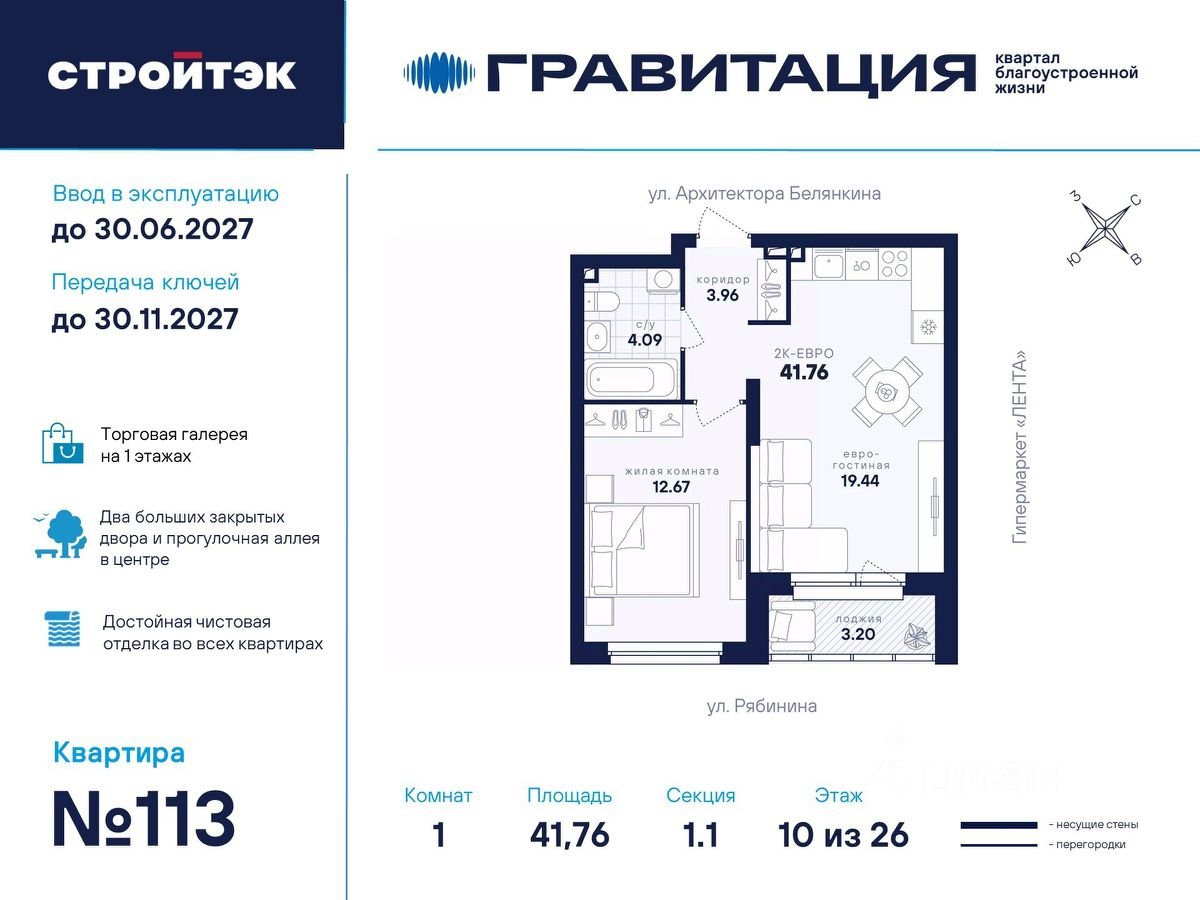Удачные решения Новый квартал благоустроенной жизни ''Гравитация'' мы разместили в периметре улиц Рябинина и Академика Ландау. У квартала 5 этапов строительства, а всю работу мы завершим к 2030 году. Авторы проекта гармонично совместили в оформлении природные элементы и современный дизайн. Волнообразные очертания на стенах вдохновлены силой ветра и движением воды. Скруглённые углы подчеркивают элегантный силуэт, а контрастная палитра акцентов и контурная подсветка верхних этажей создают выразительный архитектурный образ. Первый этап строительства: — Секция 1.1 — 1 подъезд 26 этажей — Секция 1.2 — 2 подъезда 16 этажей — Секция 1.3 — 1 подъезд 12 этажей Здесь всё и сразу Гравитация — уютный и обособленный, и в то же время открытый и просторный квартал. Всё рядом: супермаркеты и парки, кино и рестораны, школы и сады. В нескольких шагах набережная реки Патрушихи. В квартале построят муниципальный детский сад на 200 мест, а на 5 этапе строительства мы возведём 6-уровневый надземный паркинг на 250 машин. На первых этажах домов для вас будет работать торговая галерея с магазинами, кафе и привычными бытовыми сервисами. В 1 этапе строительства 631 квартира. Своя вселенная Развитый Академический район удобен и молодым семьям, и школьникам, и состоявшимся профессионалам. Рядом большой Преображенский парк с озером и Юго-Западный лесопарк с Тропой здоровья. — 3 минуты до Гипер Ленты — 10 минут на машине до ТРЦ ''Академический'', 15 минут до ЕКАД, 25 до центра — 6 школ и 6 детских садов — Спортивные комплексы и клубы Wake up, Bright Fit и Юность Богатые возможности В квартале два просторных закрытых двора общей площадью 1,4 гектара. Один двор объединяет 1 и 2 этапы строительства, другой — 3, 4 и 5 этапы. Между дворами — камерная прогулочная аллея для неспешных вечеров или полуденного отдыха. Во дворе первого этапа — зелёные участки из хвойных деревьев, акцентных кустарников и травянистых многолетников, а также сеть дорожек, детская площадка с песочницей, аттракционами и геопластикой, настольный теннис и зона для зарядки. А для комфорта и безопасности — вечернее освещение, охрана и постоянное видеонаблюдение. Пространство с заботой В просторных светлых лобби Гравитации — интеллигентный дизайн, помещения для колясок, высокие витражи и комфортная мебель. Выходы сквозные, на улицу и во двор. Лифты грузоподъёмностью 1000 и 450 кг. Мы подготовили для вас 44 уникальных варианта продуманных планировок, в том числе с кухнями-гостиными, гардеробными и мастер-спальнями. Здесь нет бесполезных зон, зато есть где посидеть в семейном кругу и разместить всё для удобства и комфорта. Современные технологии Мы позаботились о достойной чистовой отделке, чтобы вы могли уделить время главному. — Виниловые обои на флизелиновой основе, окрашенные стены в санузлах и на лоджиях — Натяжные потолки везде, кроме лоджий, там — окрашенные — Прочный влагостойкий ламинат и керамическая плитка — Межкомнатные двери светлых тонов и сейф-дверь на входе — Эргономичное размещение розеток и выключателей