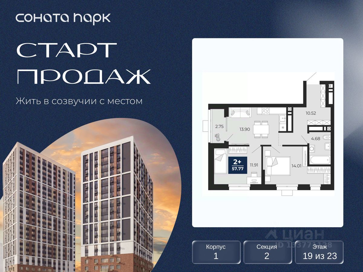 Двухкомнатная квартира от застройщика с предчистовой отделкой в ЖК ''Соната Парк'' на 19 этаже. Общая площадь: 56.4 кв.м., жилая: 25.92 кв.м., площадь просторной кухни-столовой: 13.9 кв.м. Угловая квартира, идеально подойдет любителям тишины и панорамных видов. В квартире одна лоджия, один совмещенный санузел. Высота потолков 2.72 м.