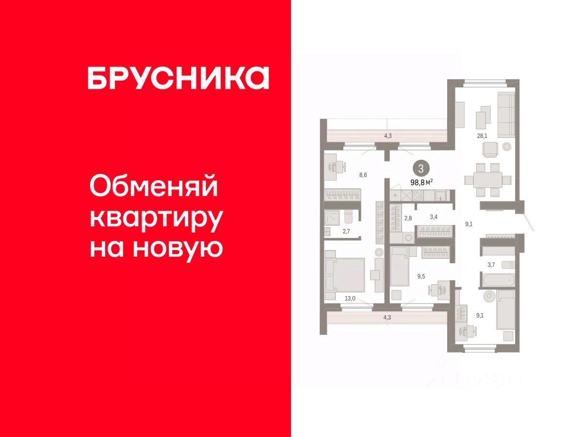 Квартира с кухней-гостиной и тремя спальнями в Бруснике в Академическом. Особенности планировки: предчистовая отделка, разнесённые спальни, терраса на крыше. квартиры в нашей базе: АКД04-Ж1.9.1.