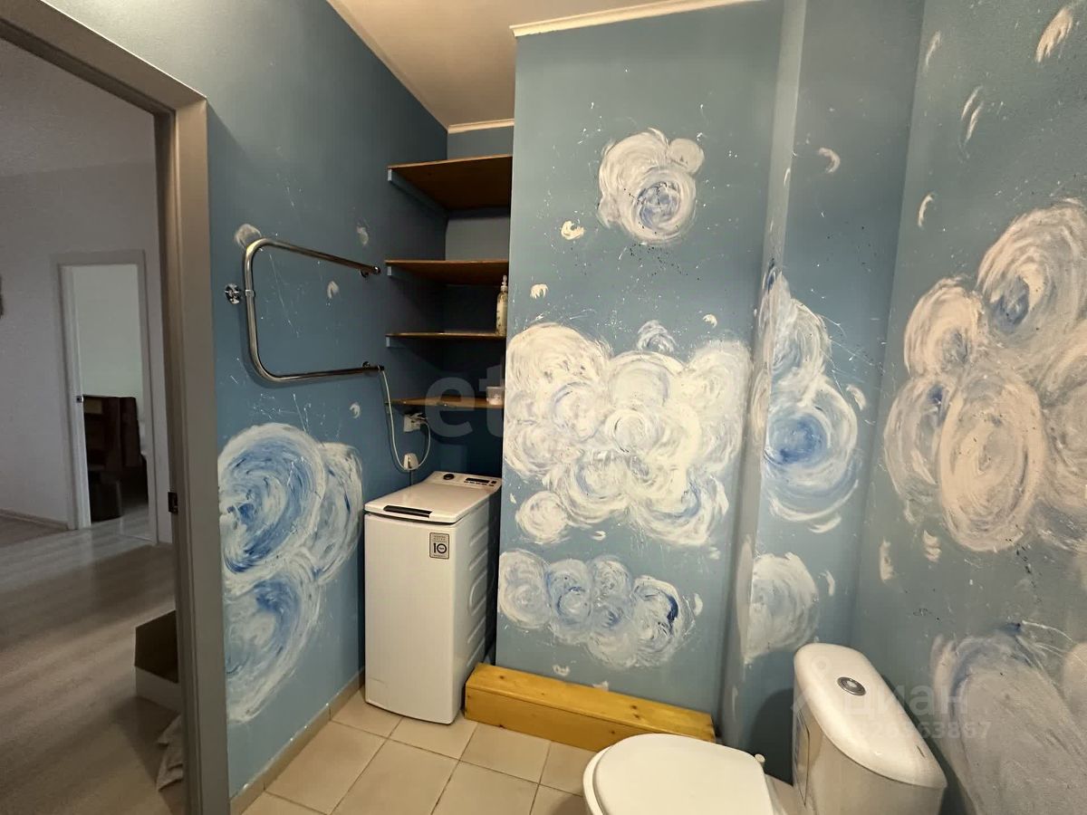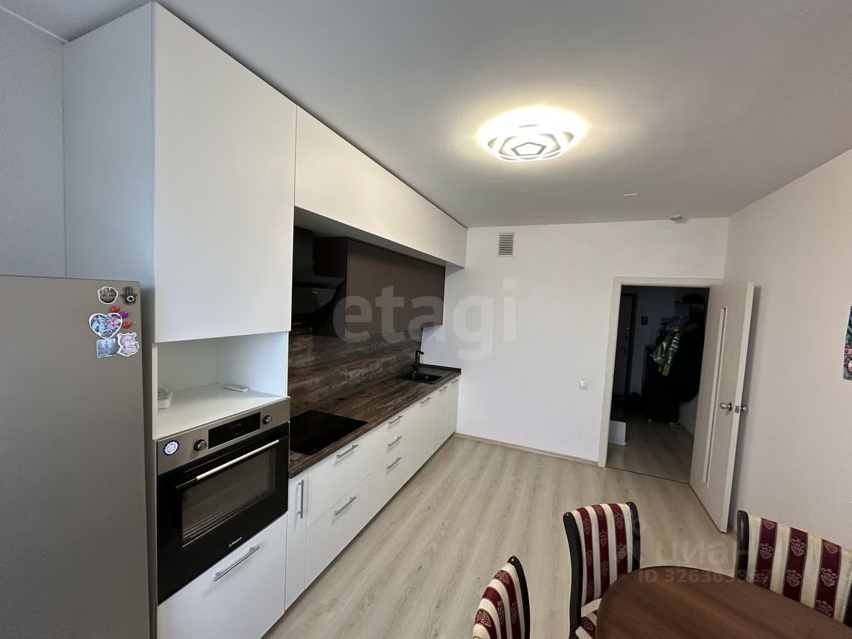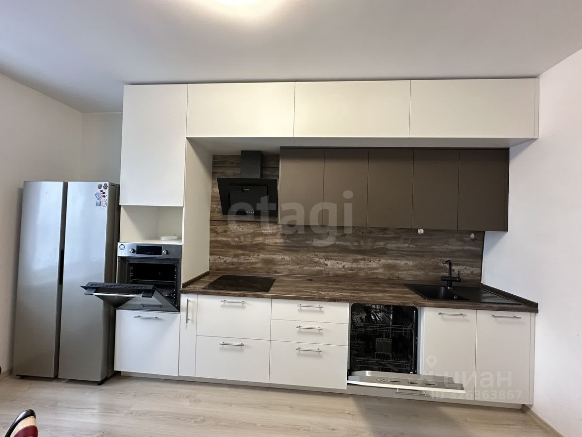 В квартире ремонт от застройщика, на полу ламинат, окна пластиковые. На кухне установлен кухонный гарнитур со всей необходимой встроенной техникой, качественный деревянный обеденный стол со стульями. В спальне двуспальная кровать и полки ручной работы из массива дерева. Есть два больших встроенных шкафа для хранения. Санузел совмещенный 4,6 м2, пол в плитке, на стенах водоэмульсионная краска, есть ниша для хранения бытовой химии.