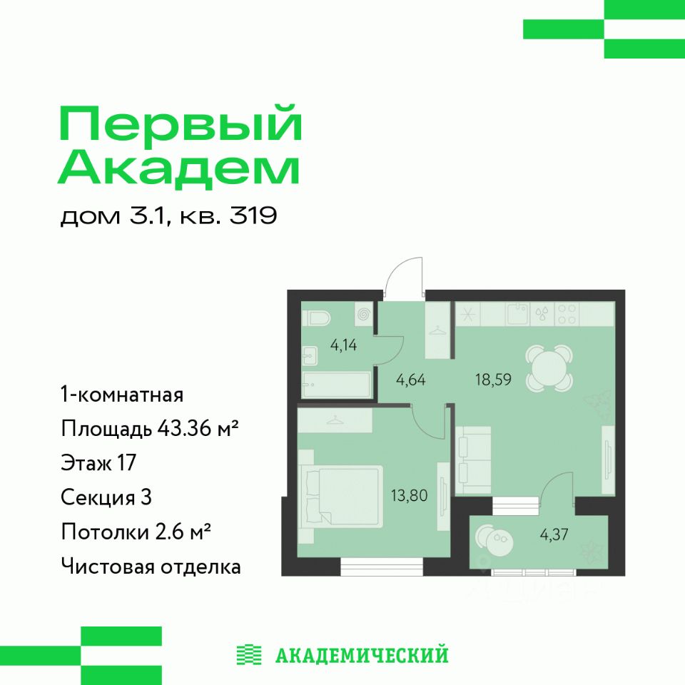 Продается 1-комнатная квартира площадью 43.36 кв.м. от девелопера ''Академический'' в жилом квартале ''Первый Академ''. Срок сдачи дома — 2 квартал 2028 года. Доступна субсидированная ипотека, выгодные условия и скидки напрямую от застройщика.