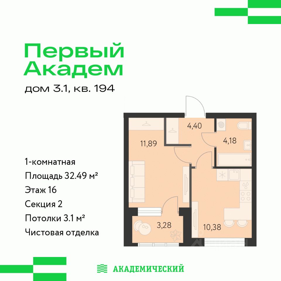 Продается 1-комнатная квартира площадью 32.49 кв.м. от девелопера ''Академический'' в жилом квартале ''Первый Академ''. Срок сдачи дома — 2 квартал 2028 года. Доступна субсидированная ипотека, выгодные условия и скидки напрямую от застройщика.