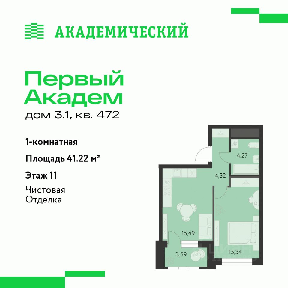 Продается 1-комнатная квартира площадью 41.22 кв.м. от девелопера ''Академический'' в жилом квартале ''Первый Академ''. Срок сдачи дома — 2 квартал 2028 года. Доступна субсидированная ипотека, выгодные условия и скидки напрямую от застройщика.