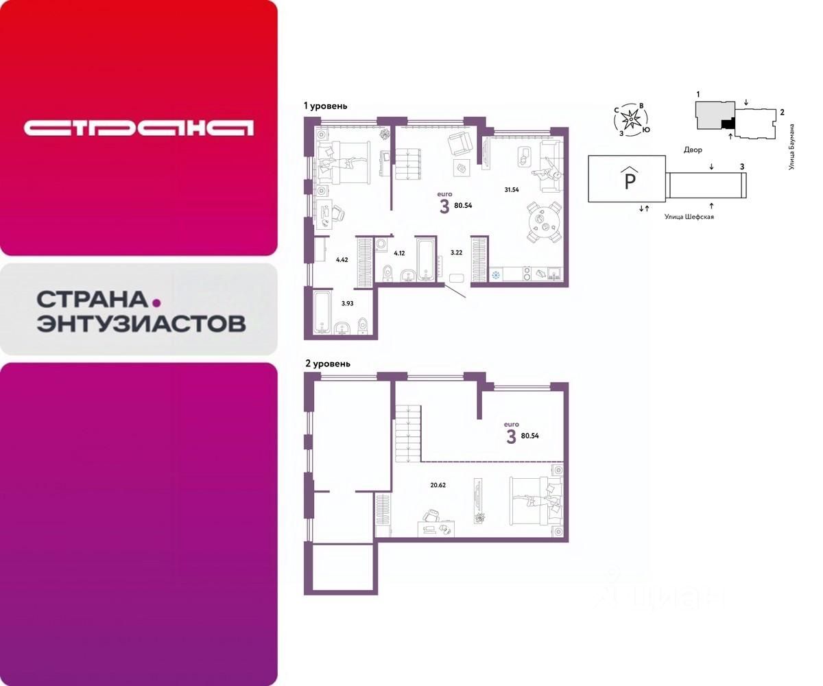 Продается 3комнатная квартира на 23 этаже от застройщика Страна Девелопмент. Площадь квартиры 80,54 кв. м.