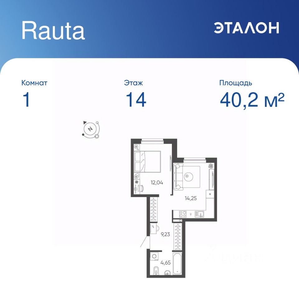 Общая площадь квартиры — 40.17 кв. м, этаж 14 из 24.