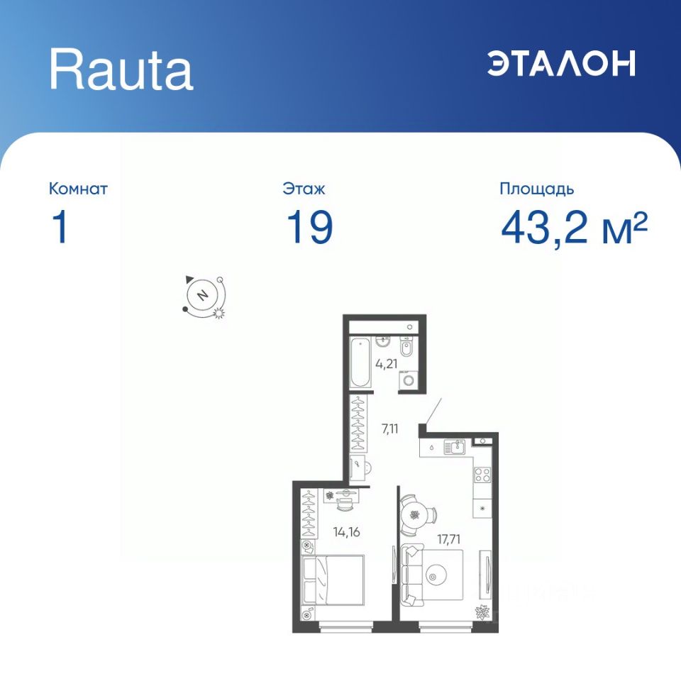 Общая площадь квартиры — 43.19 кв. м, этаж 19 из 24.