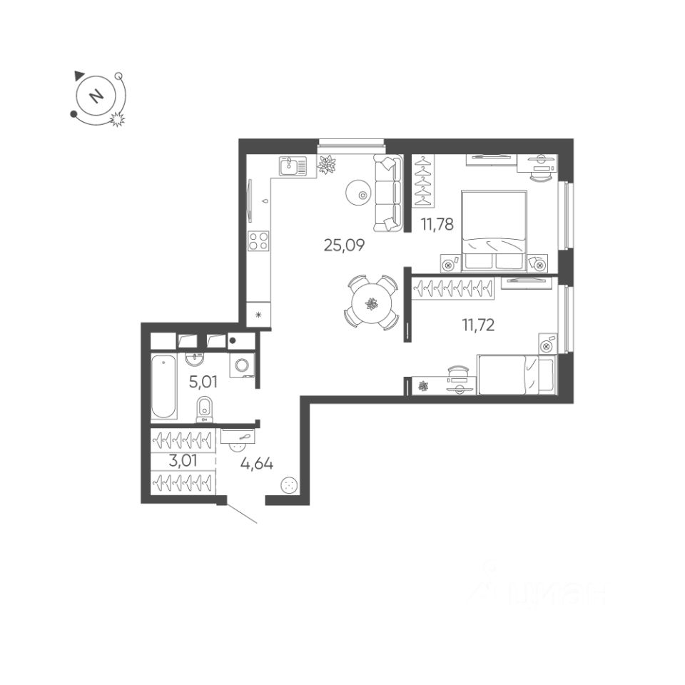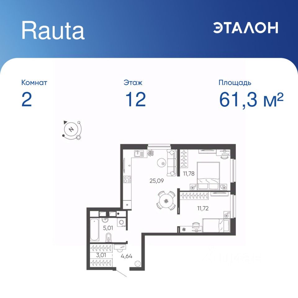 Общая площадь квартиры — 61.25 кв. м, этаж 12 из 24.