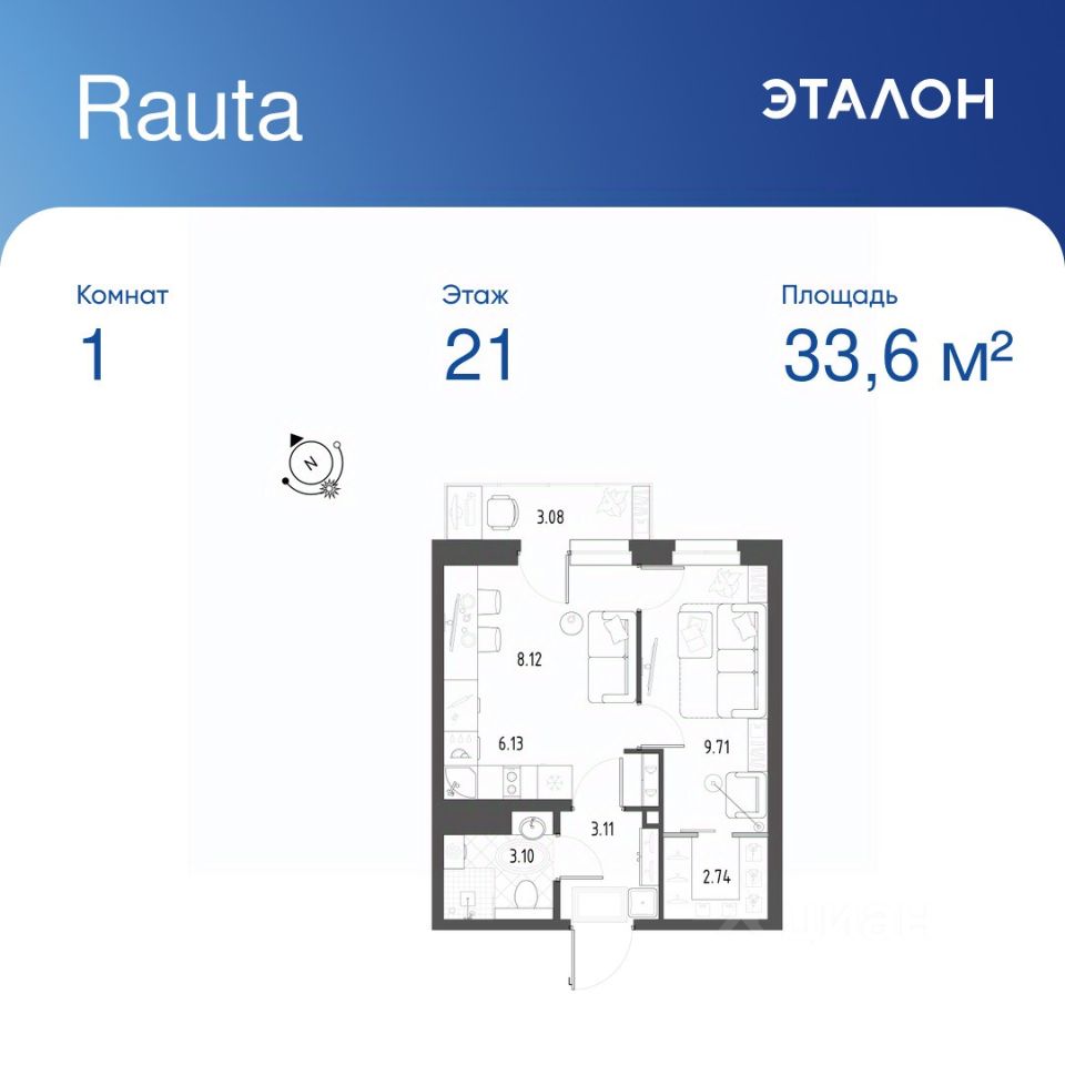Общая площадь квартиры — 33.6 кв. м, этаж 21 из 22.