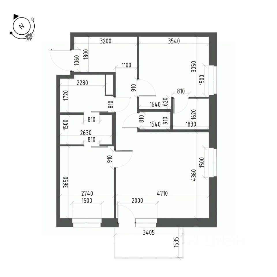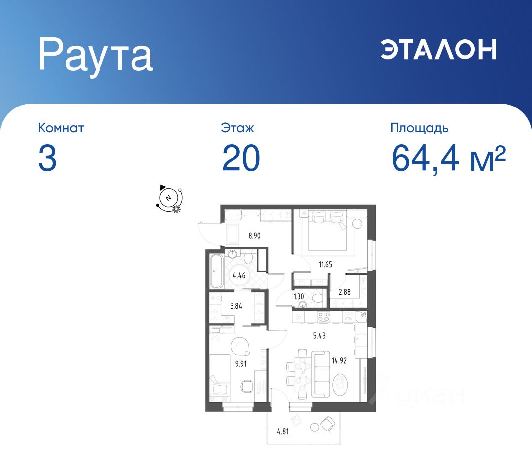 Общая площадь квартиры — 64.4 кв. м, этаж 20 из 22.