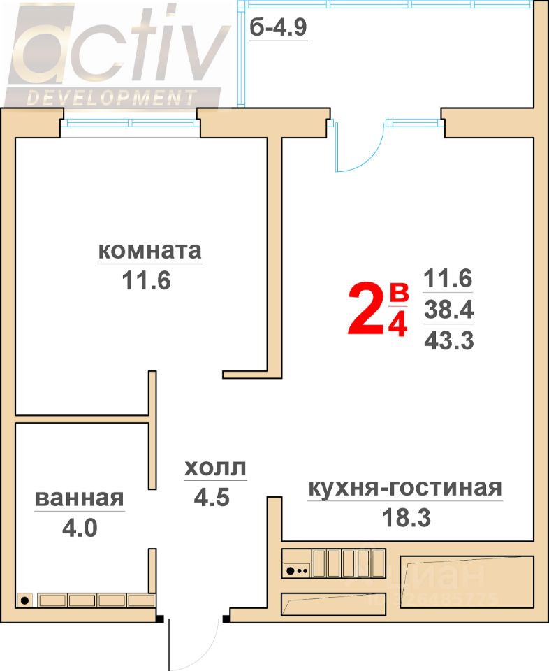 Общая площадь38,4 м2