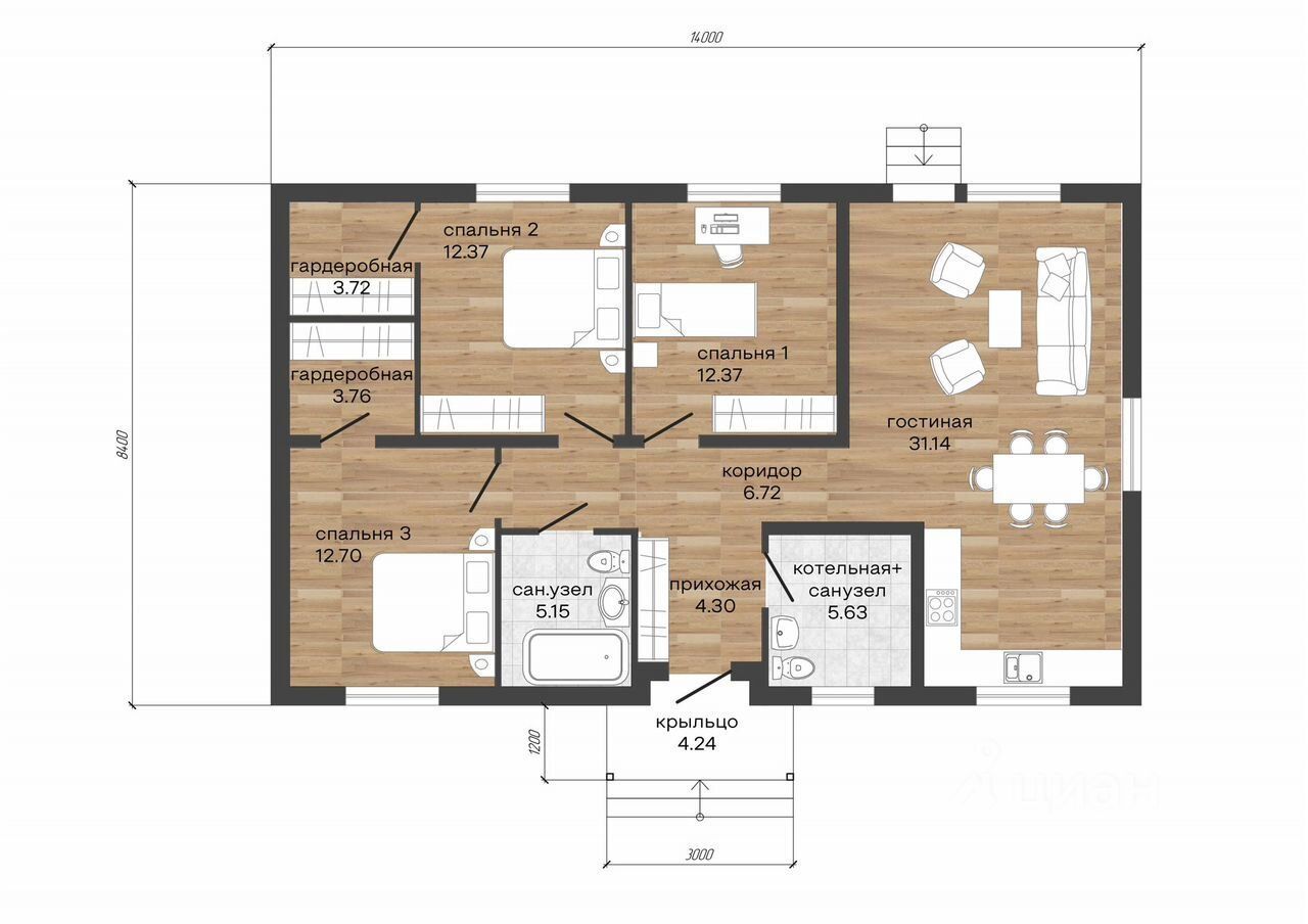 Одноэтажный дом, Кухня-гостиная 32 м2, 3 спальни по 12,5 м2, Гардеробная 7,5 м2, Санузел 5 м2, Прихожая 4,5 м2, Коридор 7м2, Холл, Котельная с санузлом 5,5 м2, Крыльцо.