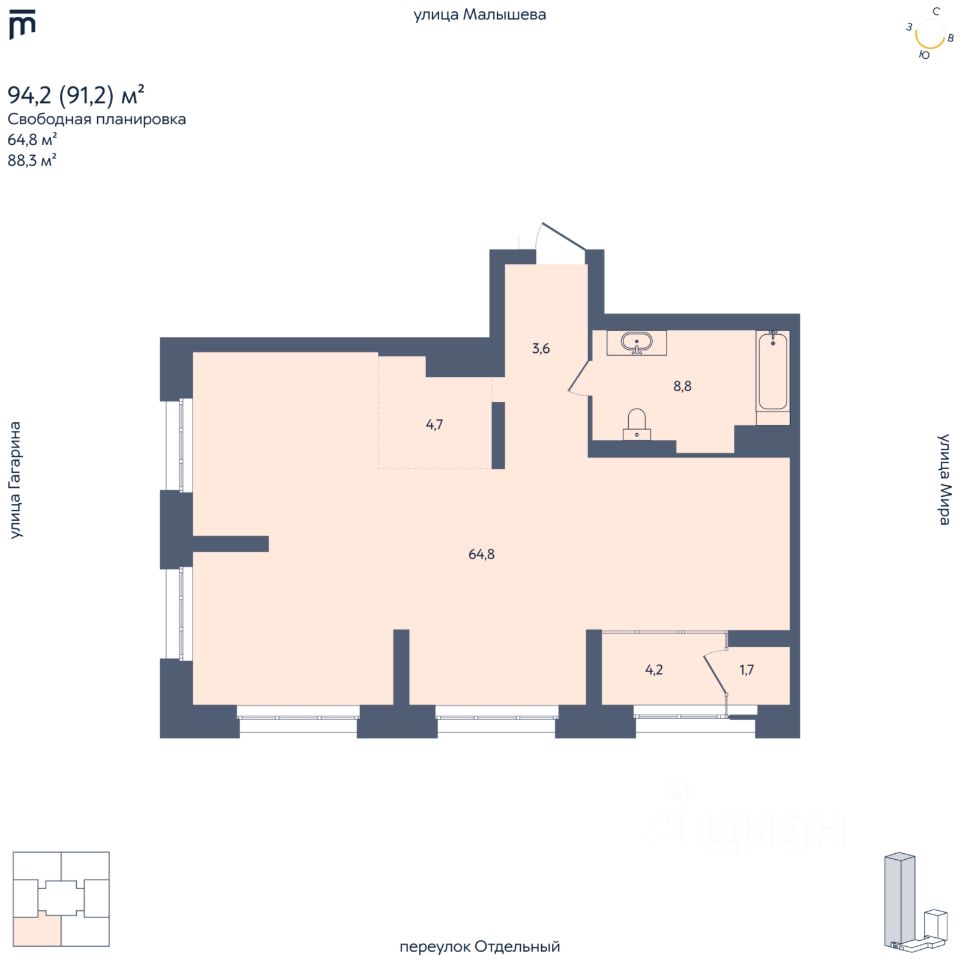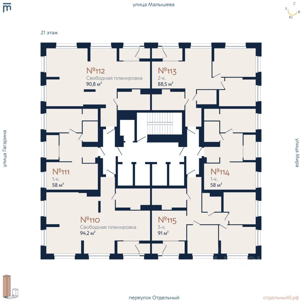 Жилой комплекс бизнес-класса ''Отдельный, 5'' рядом с УРФУ. Новый жилой комплекс бизнес-класса в Кировском районе Екатеринбурга (Втузгородок), расположенный в тихом квартале между улицами Малышева, Мира и Гагарина. Архитектурный ансамбль состоит из двух секций высотой 29 и 8 этажей, объединенных стилобатом с коммерческими помещениями и семейным кафе. Комплекс создан для комфортной и приватной жизни людей, ценящих простор, безопасность и современный уровень сервиса. Преимущества ЖК ''Отдельный, 5'' 1. Просторные и комфортные планировки бизнес-класса Минимальная площадь квартир начинается от 58 м². Предусмотрены варианты с просторными кухнями-гостиными, мастер-спальнями, кабинетами и функцинальными ванными. Теплая лоджия в каждой квартире.
