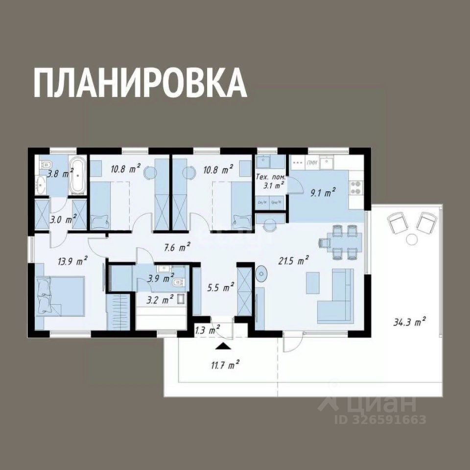Главная особенность: просторная кухня-гостиная с высокими потолками и панорамными окнами.
