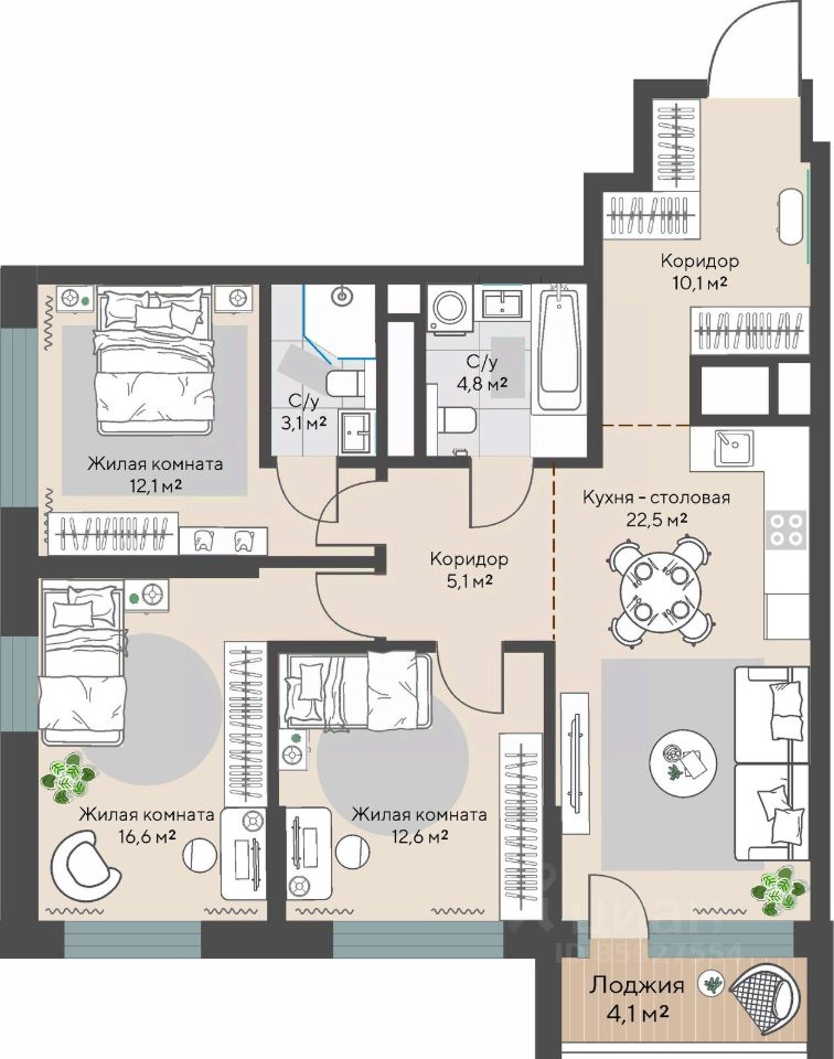 Продаётся 3-комнатная квартира в строящемся доме (Дом 1 этап 1.1), срок сдачи: I-кв. 2028, общей площадью 89 кв.м., на 13 этаже.