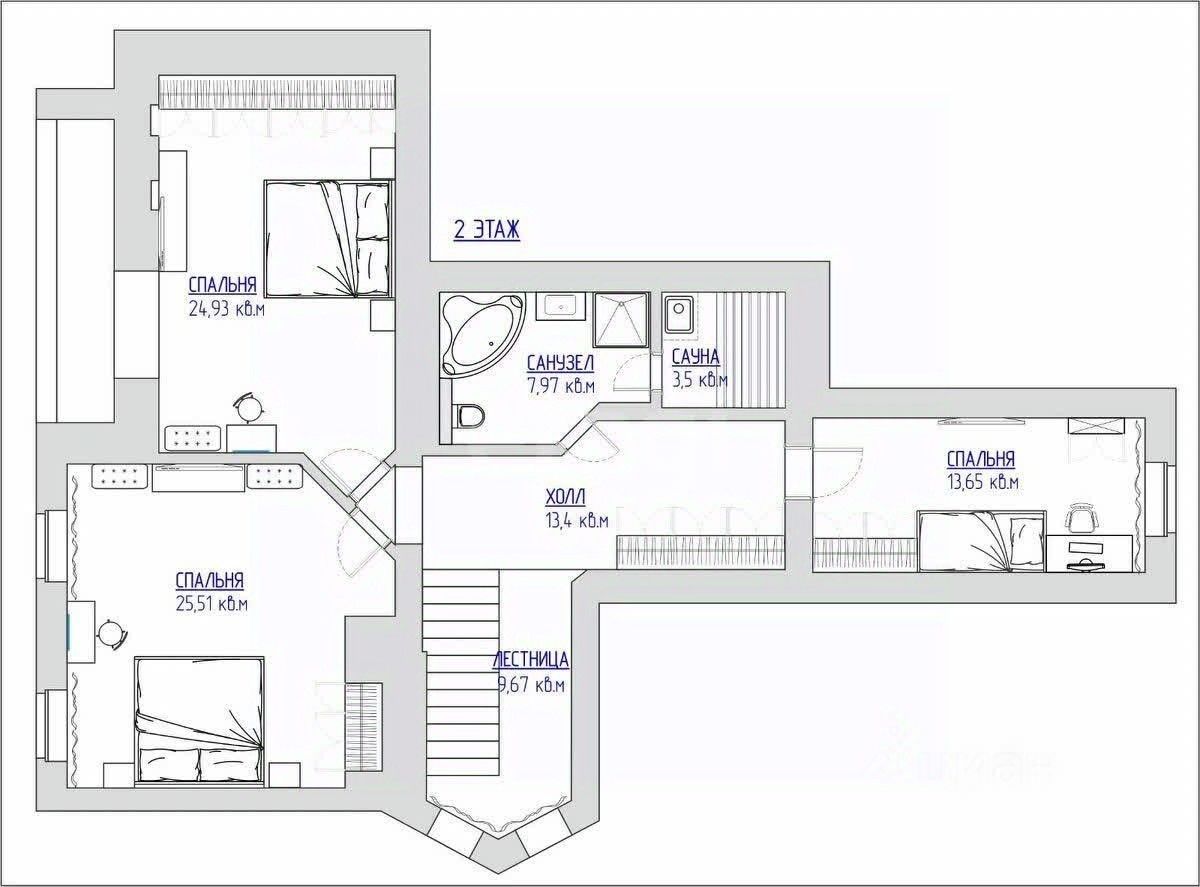 Площадь 203 м², два этажа + терраса 15 м². На первом: прихожая, холл, гостиная с камином, санузел, кладовая (можно сделать постирочную). На втором: 3 спальни, санузел, финская сауна с электропечью.